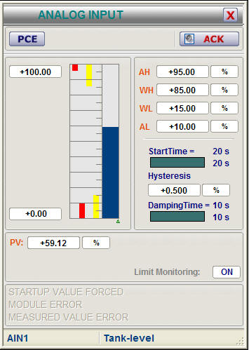 WinCC mimic, with variable attributes to display the state of the analog input.